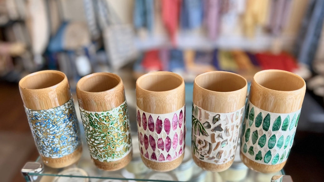 No two alike. Handmade in Vietnam with real bamboo and mother-of-pearl.