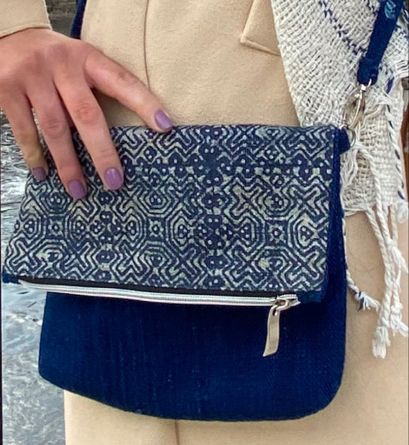 This folding cross body is made with hemp batik from Hmong villages in northern Vietnam. Fully lined in 100% cotton, with an inside pocket.