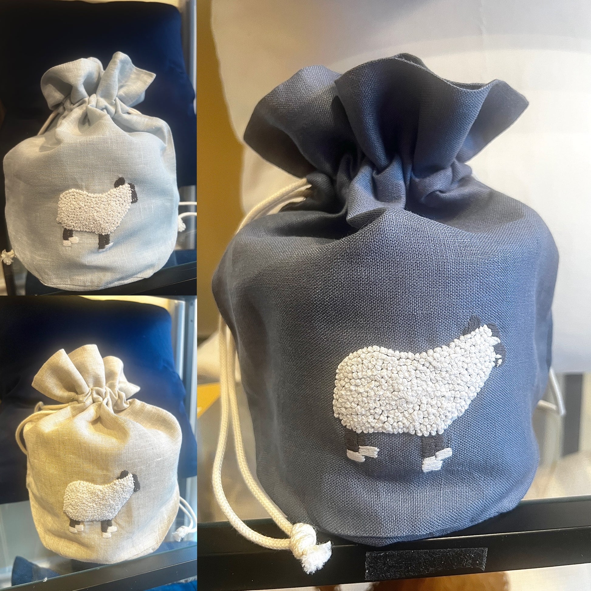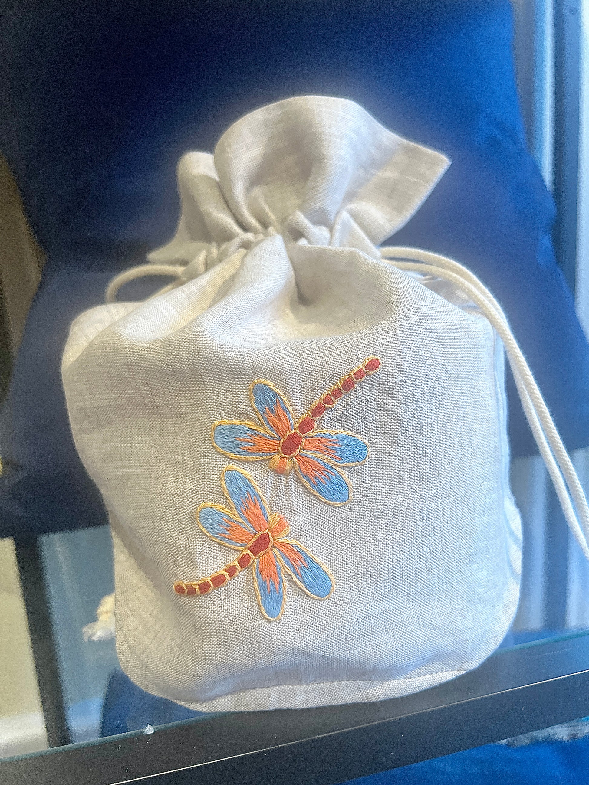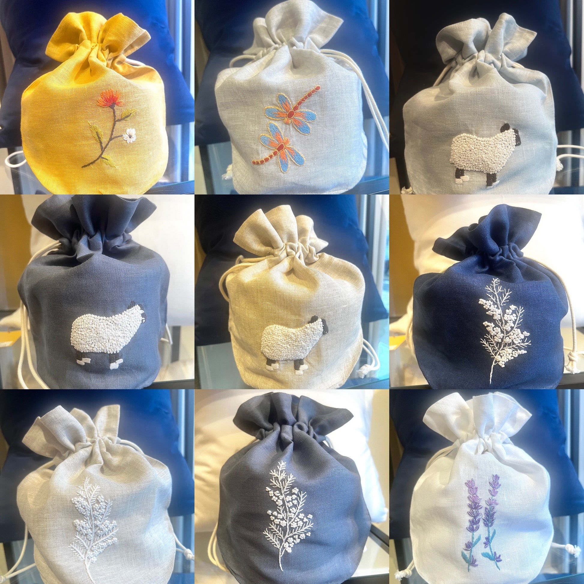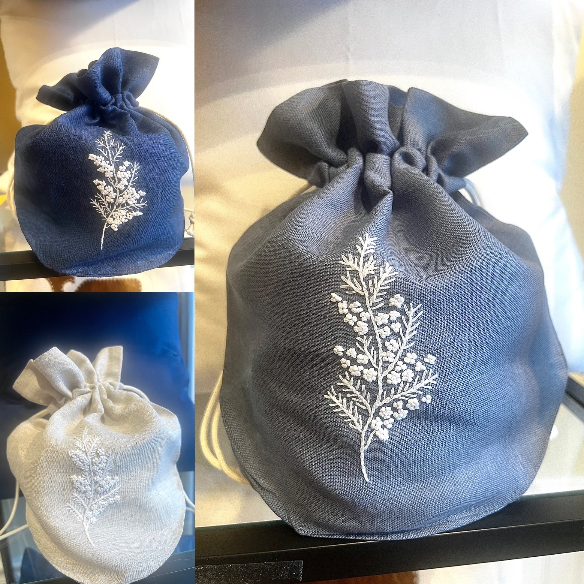 "Botanicals" Lg Drawstring Bag, hand embroidered linen